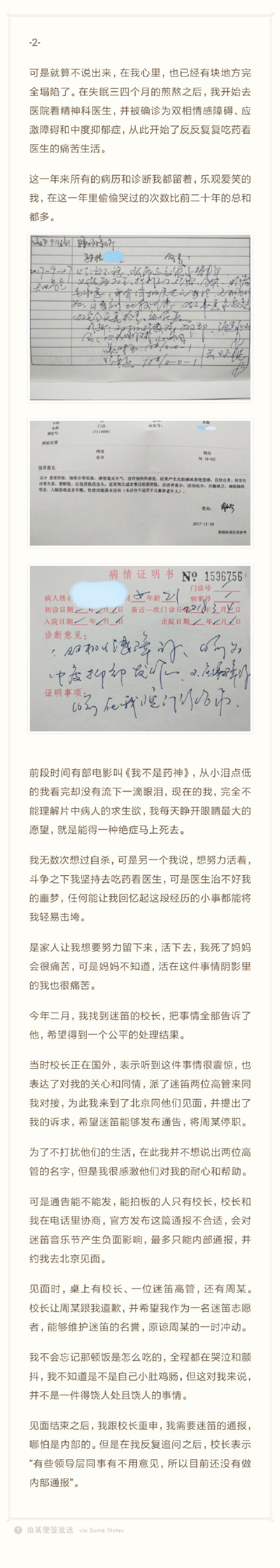 #摇滚圈me2# 21岁的女生私信求助:参加过迷笛音乐节志愿者服务七次的她,在2017年五一的太湖迷笛音乐节上,被同组的分管老师、也是迷笛的副总周翊性侵。这一年来,她患上了应激障碍和抑郁症,今年鼓起勇气向迷笛校长、音乐节创始人张帆反映,但是张帆却希望她能原谅性侵犯,维护迷笛音乐节的声誉。百度资料显示:“迷笛音乐节”是由中国地下摇滚乐队的发源地——北京迷笛音乐学校创办的国内第一个原创音乐节,经过十多年的发展,已成为现代音乐最响亮的品牌之一。每年都有几十支国内外的知名乐队受邀参加演出,更有几万狂热的乐迷从全国各地蜂拥而来,国内外百余家知名媒体都在关注它的动态,竞相报道与之相关的消息,迷笛又被称为中国的“伍德斯托克”(Woodstock)。求助的女生说:我做好了随时去死的准备,但在此之前我愿意抗争。图1-4是她写的事情经过,图5是她向我求助的部分私信内容,图6是她的病情诊断证明