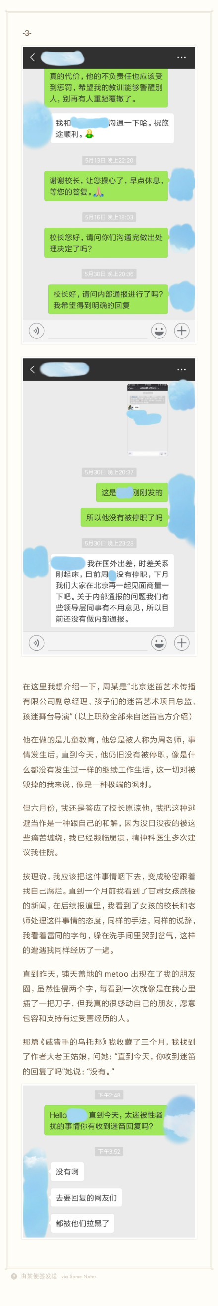 我很感激校长在处理过程中对我的耐心和帮助,也理解作为创始人想要维护音乐节的出发点,但我不能接受高喊着“爱与和平”去包庇作奸犯科的伪善行为,压下一切息事宁人,正如之前性骚扰的文章中写到,“沉默与帮凶无异,都是助长邪恶的推手。”