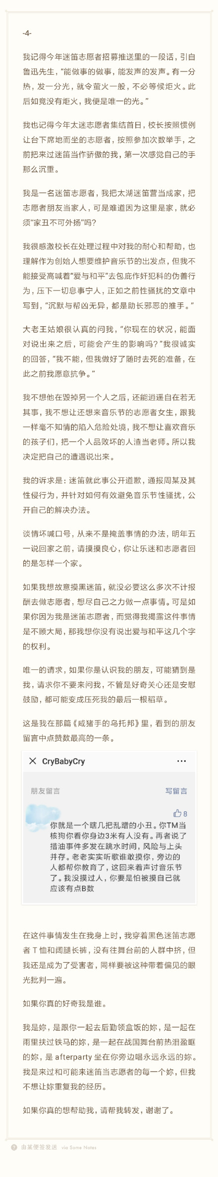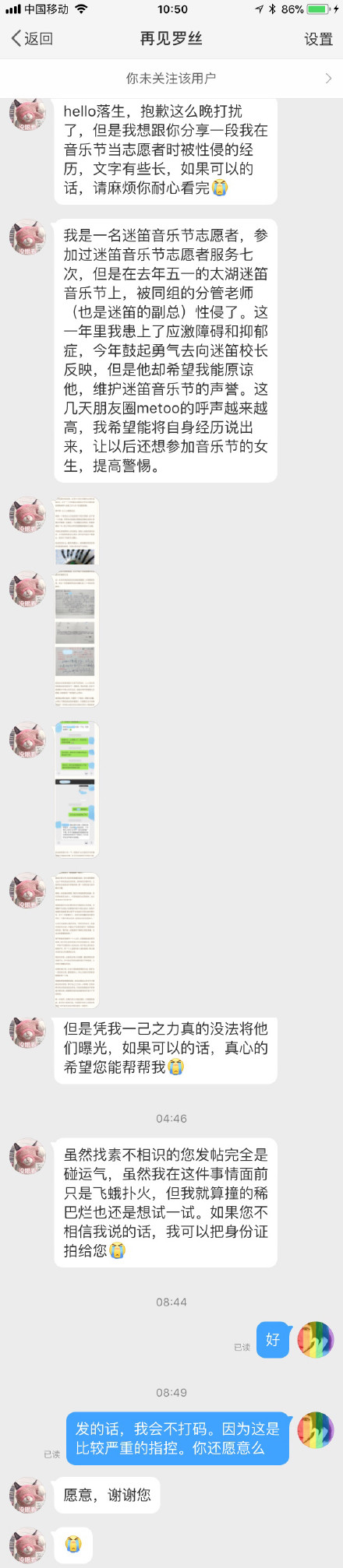 我不想他在毁掉另一个人之后,还能逍遥自在若无其事,我不想让还想来音乐节的志愿者女生,跟我一样毫不知情的陷入危险处境,我不想让喜欢音乐的孩子们,把一个人品败坏的人渣当老师。所以我决定把自己的遭遇说出来。