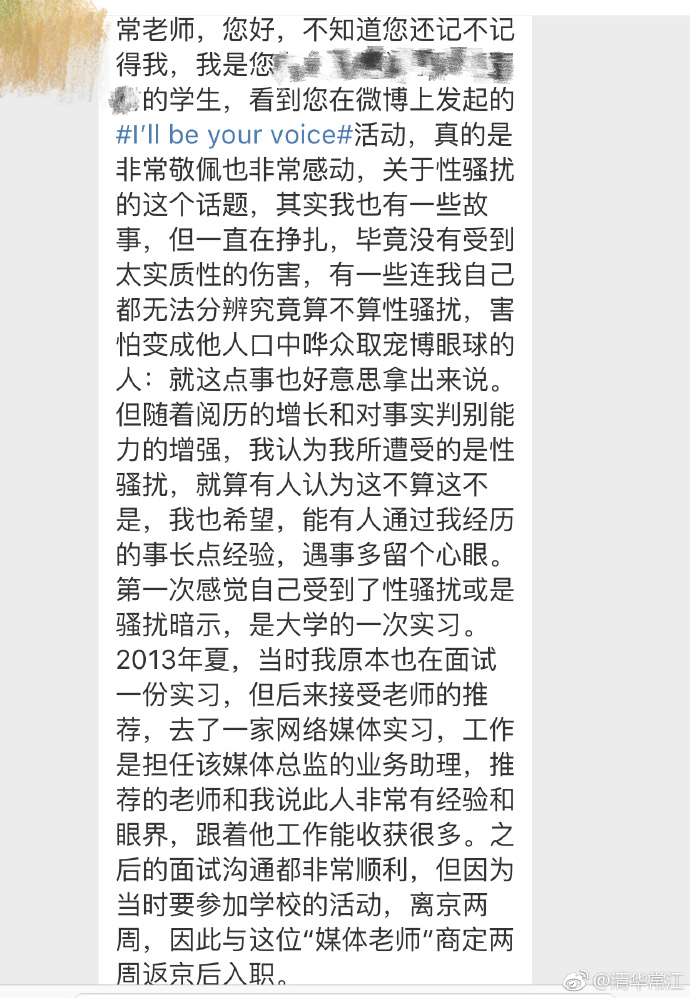 常老师,您好,不知道您还记不记得我,我是您XXXX的学生,看到您在微博上发起的#I’ll be your voice#活动,真的是非常敬佩也非常感动,关于性骚扰的这个话题,其实我也有一些故事,但一直在挣扎,毕竟没有受到太实质性的伤害,有一些连我自己都无法分辨究竟算不算性骚扰,害怕变成他人人口中哗众取宠博眼球的人:就这点事也好意思拿出来说。但随着阅历的增长和对事实判别能力的增强,我认为我所遭受的是性骚扰,就算有人认为这不算这不是,我也希望,能有人通过我经历的事长点经验,遇事多留个心眼。第一次感觉自己受到了性骚扰或是骚扰暗示,是大学的一次实习。2013年夏,当时我原本也在面试一份实习,但后来接受老师的推荐,去了一家网络媒体实习,工作是担任该媒体总监的业务助理,推荐的老师和我说此人非常有经验和眼界,跟着他工作能收获很多。之后的面试沟通都非常顺利,但因为当时要参加学校的活动,离京两周,因此与这位“媒体老师“商定两周返京后入职。