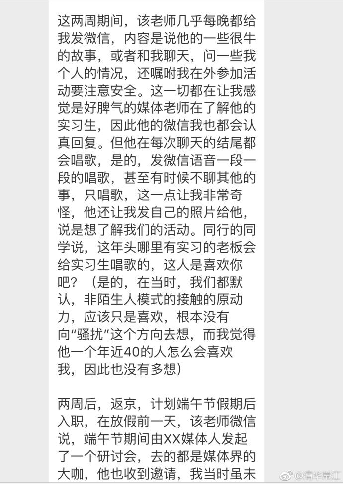 这两周期间,该老师几乎每晚都给我发微信,内容是说他的一些很牛的故事,或者和我聊天,问一些我个人的情况,还嘱咐我在外参加活动要注意安全。这一切都在让我感觉是好脾气的媒体老师在了解他的实习生,因此他的微信我也都会认真回复。但他在每次聊天的结尾都会唱歌,是的,发微信语音一段一段的唱歌,甚至有时候不聊其他的事,只唱歌,这一点让我非常奇怪,他还让我发自己的照片给他,说是想了解我们的活动。同行的同学说,这年头哪里有实习的老板会给实习生唱歌的,这人是喜欢你吧?(是的,在当时,我们都默认,非陌生人模式的接触的原动力,应该只是喜欢,根本没有向“骚扰”这个方向去想,而我觉得他一个年近40的人怎么会喜欢我,因此也没有多想)