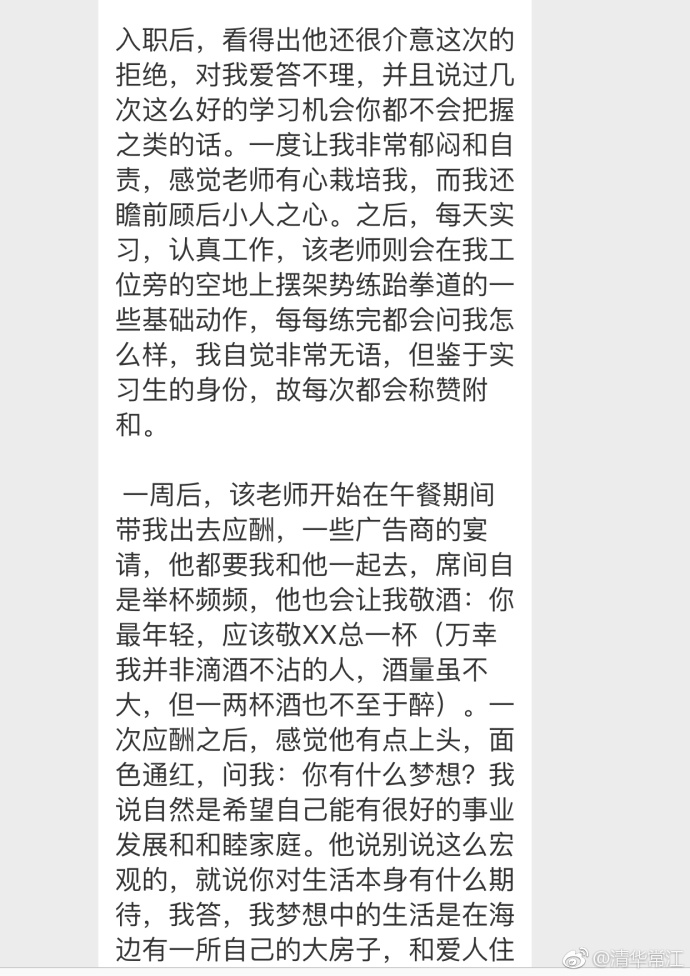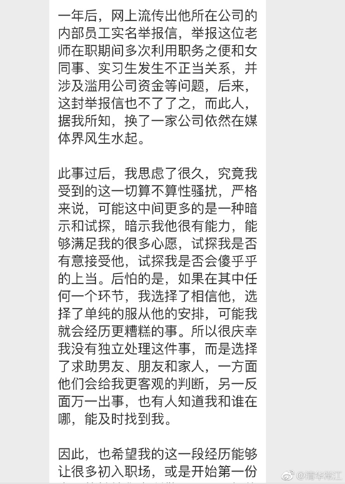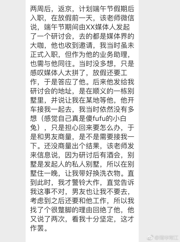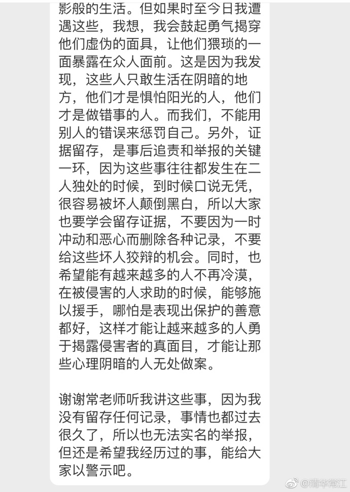 7月29日,清华常江在微博展示了一位性侵受害者叙述的经历,并附评论——