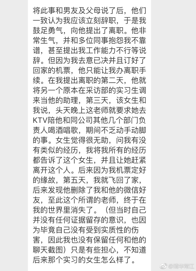 将此事和男友及父母说了后,他们一致认为我应该立刻辞职,于是我鼓足勇气,向他提出了离职。他非常生气,并和多位同事抱怨我不靠谱其至提出我工作能力不行等说辞。但因为我去意已决并且订好了回家的机票,他只能让我办离职手续。在我提出离职的第二天,他就将另一个原本在采访部的实习生调来当他的助理,第三天,该女生和我说,头天晚上这老师就要求她去KTV陪他和同公司其他几个部门负责人喝酒唱歌,期间不乏动手动脚的事。女生觉得很无助,问我有没有类似的经历,我将我所有的经历都告诉了这个女生,并且让她赶紧离开这个人。后来因为我机票定好的缘故,第五天,我就飞回了家,后来发现他删除了我和他的微信好友,至此这个所谓的老师,终于在我的世界里消失了。(但当时自己并没有任何证据留存的意识,也因为毕竟自己没有受到实质性的伤害,因此我也没有保留任何和他的聊天截图)只是有些担心,不知道后来那个实习的女生怎么样了。