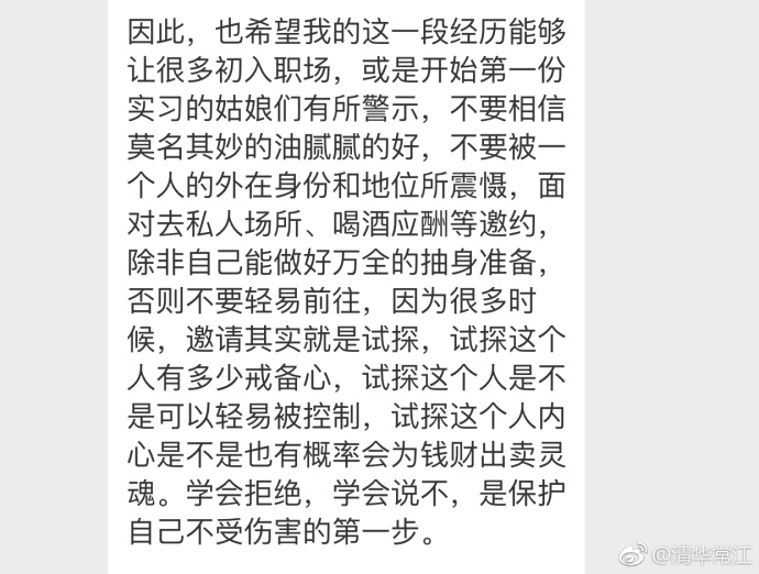 因此,也希望我的这一段经历能够让很多初入职场,或是开始第一份实习的姑娘们有所警示,不要相信莫名其妙的油腻腻的好,不要被一个人的外在身份和地位所震慑,面对去私人场所、喝酒应酬等邀约,除非自己能做好万全的抽身准备,否则不要轻易前往,因为很多时候,邀请其实就是试探试探这个人有多少戒备心,试探这个人是不是可以轻易被控制,试探这个人内心是不是也有概率会为钱财出卖灵魂。学会拒绝,学会说不,是保护自己不受伤害的第一步。