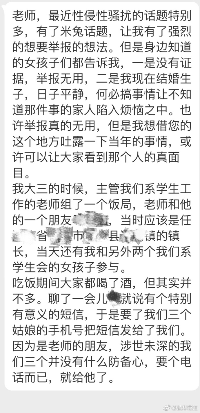 老师,最近性侵性骚扰的话题特别多,有了米兔话题,让我有了强烈的想要举报的想法。但是身边知道的女孩子们都告诉我,一是没有证据,举报无用,二是我现在结婚生子,日子平静,何必搞事情让不知道那件事的家人陷入烦恼之中。也许举报真的无用,但是我想借您的这个地方吐露一下当年的事情,或许可以让大家看到那个人的真面目。我大三的时候,主管我们系学生工作的老师组了一个饭局,老师和他的一个朋友,当时应该是任X省X市X县X镇的镇长,当天还有我和另外两个我们系学生会的女孩子参与。吃饭期间大家都喝了酒,但其实并不多。聊了一会儿就说有个特别有意义的短信,于是要了我们三个姑娘的手机号把短信发给了我们。因为是老师的朋友,涉世未深的我们三个并没有什么防备心,要个电话而已,就给他了……
