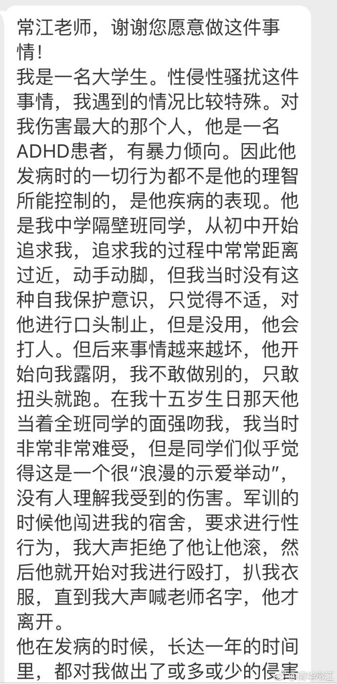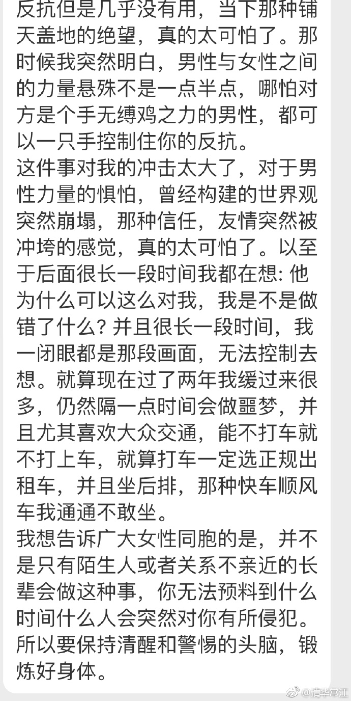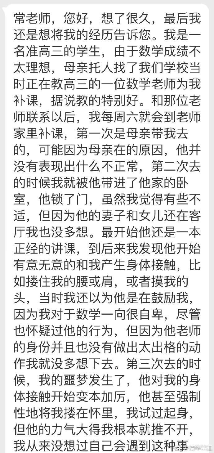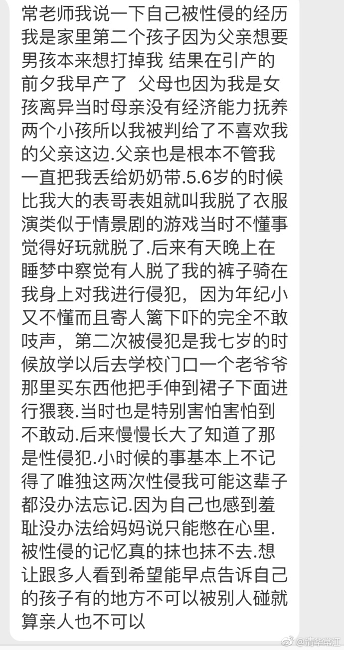 7月29日,清华常江在微博发布了一篇经过保密处理的性侵受害者自述。并附评论——