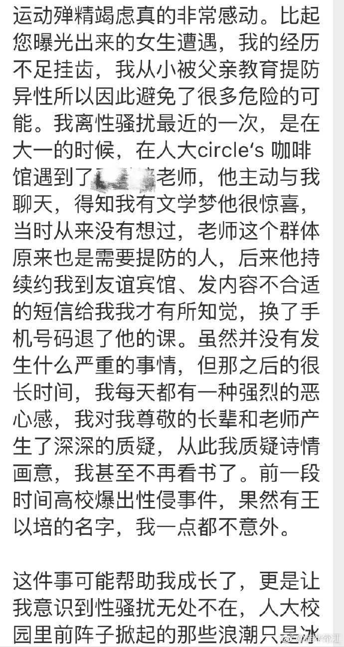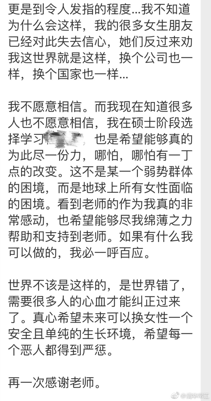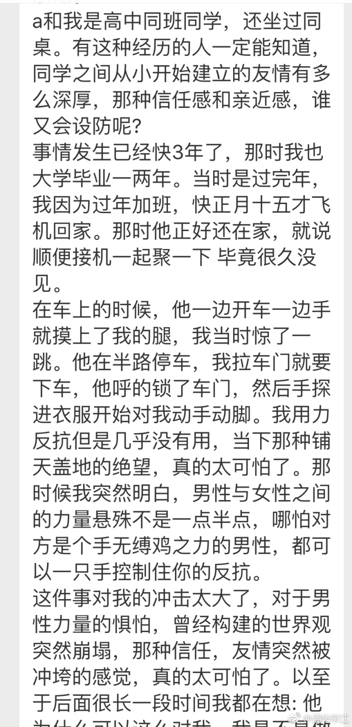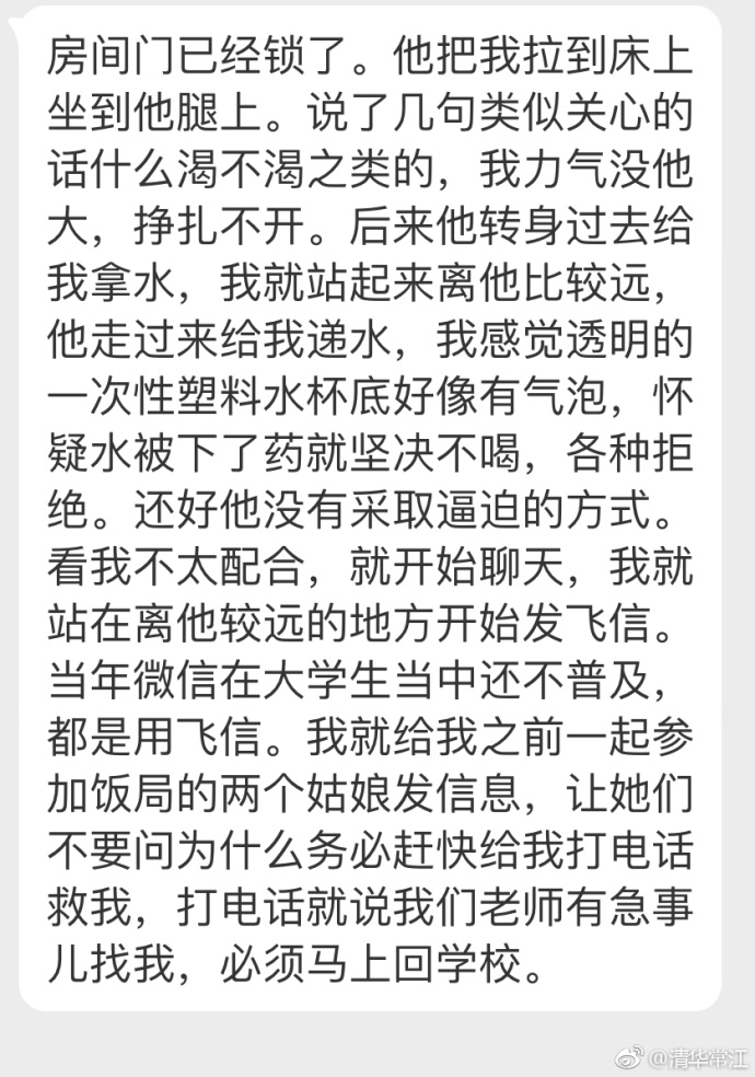 7月29日,清华常江在微博发布了一篇经过保密处理的性侵受害者自述。并附评论——