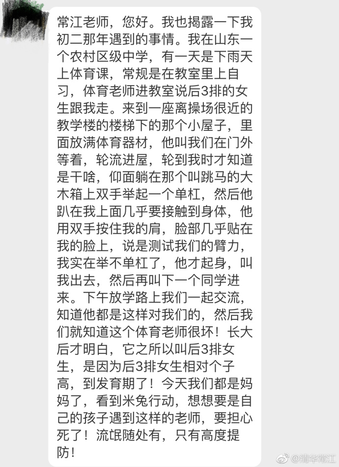 常江老师,您好。我也揭露一下我初二那年遇到的事情。我在山东一个农村区级中学,有一天是下雨天上体育课,常规是在教室里上自习,体育老师进教室说后3排的女生跟我走。来到一座离操场很近的教学楼的楼梯下的那个小屋子,里面放满体育器材,他叫我们在门外等着,轮流进屋,轮到我时才知道是干啥,仰面躺在那个叫跳马的大木箱上双手举起一个单杠,然后他趴在我上面几乎要接触到身体,他用双手按住我的肩,脸部几乎贴在我的脸上,说是测试我们的臂力,我实在举不单杠了,他才起身,叫我出去,然后再叫下一个同学进来。下午放学路上我们一起交流,知道他都是这样对我们的,然后我们就知道这个体育老师很坏!长大后才明白,它之所以叫后3排女生,是因为后3排女生相对个子高,到发育期了!今天我们都是妈妈了,看到米兔行动,想想要是自己的孩子遇到这样的老师,要担心死了!流氓随处有,只有高度提防!