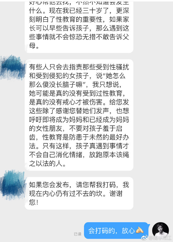 有些人只会去指责那些受到性骚扰和受到侵犯的女孩子,说“她怎么那么傻没长脑子嘛”,我只想说,她可能是真的没有受到过性教育,是真的没有戒心才被伤害。给您发这些除了感谢您替她们发声,也想呼吁即将成为妈妈和已经成为妈妈的女性朋友,不要对孩子羞于启。齿,性教育是防患于未然的最好办法。只有这样,孩子真遇到事情才不会自己消化情绪,放跑原本该绳之以法的人。