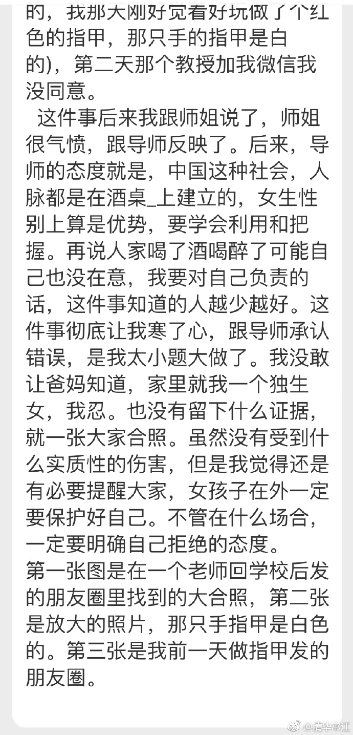 今年四月份下旬,我跟导师一起去河南开会。饭局上一个教授借着敬酒拍照对我动手动脚(摸、捏我的臀部,使劲楼我的腰。我性子软弱,当着那么多人的面没有强制推开他。)当时可是有十几号人,都是某大学有头有脸的人物。(证据就是饭局上一张大合照,那个时候他正使劲接着我的腰,结果手穿过我腰好像还不小心挽在了另一个人身上,看起来就像是我挽着我旁边那个人一样。这个照片就出来很多人问我为什么挽着旁边那个人,我欲哭无泪,那只咸猪手不是我的,我那天刚好觉着好玩做了个红色的指甲,那只手的指甲是白的),第二天那个教授加我微信我没同意。这件事后来我跟师姐说了,师姐很气愤,跟导师反映了。后来,导师的态度就是,中国这种社会,人脉都是在酒桌上建立的,女生性别上算是优势,要学会利用和把握。再说人家喝了酒喝醉了可能自己也没在意,我要对自己负责的,话,这件事知道的人越少越好。这件事彻底让我寒了心,跟导师承认错误,是我太小题大做了。我没敢让爸妈知道,家里就我一个独生女,我忍。也没有留下什么证据,就一张大家合照。虽然没有受到什么实质性的伤害,但是我觉得还是有必要提醒大家,女孩子在外一定要保护好自己。不管在什么场合,一定要明确自己拒绝的态度。第一张图是在一个老师回学校后发的朋友圈里找到的大合照,第二张是放大的照片,那只手指甲是白色的。第三张是我前一天做指甲发的朋友圈……