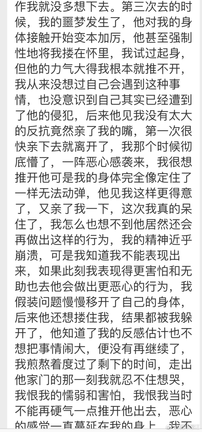 到了晚上,这才第二天,我洗完澡以后准备睡觉,想起白天记录口述的方式沒有和他确认是不是以后都用这种记录形式,我就打开门,看他站在客厅,我叫了一声老师,他突然整个人朝我压过来,然后转到后面去从后面整个抱住我,在我耳边说了一句“你今天真性感”。真的,时至今日,这句话是我最恶心的话,沒有之一,我一想起那天的场景我就起鸡皮疙瘩,甚至想吐,但是我孤身一人在异乡,又和一个人高马大的男人单独在一个房子,我特別怕我強烈的反抗会有生命危险,因为对我来说,命是最重要的。然后我就努力挣脱他,还一边试图用道德喚醒他,给他说老师这不好。可能是我真的从未松懈,他后来放开我问我有什么事,我为了缓解当时的尴尬和恐惧,我真的又把我出房间的目的给他说一了遍,但此后他说的每句话我都听不进去,并且以各种时机结束对话。