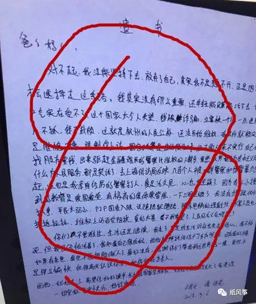 不幸的是,她也是位屁2屁跑路事件的受害者,当她多年的血汗钱被诈骗集团圈走,想到了她的祖国时。不料立案月余没有丝毫进展,当局既不抓人也不追回资金,她自己反而成了维|稳的对象,还亲眼目睹了上F维|权|者被警|察暴力驱打的场景。瞬时三观崩塌,爱了这么多年的国,竟也“还”了,信中的最后一段是留给她女儿的,告诫她好好读书,将来留学移民。可见绝望之深,随后,便上吊身亡。天朝的媒体,没有一家敢报导。