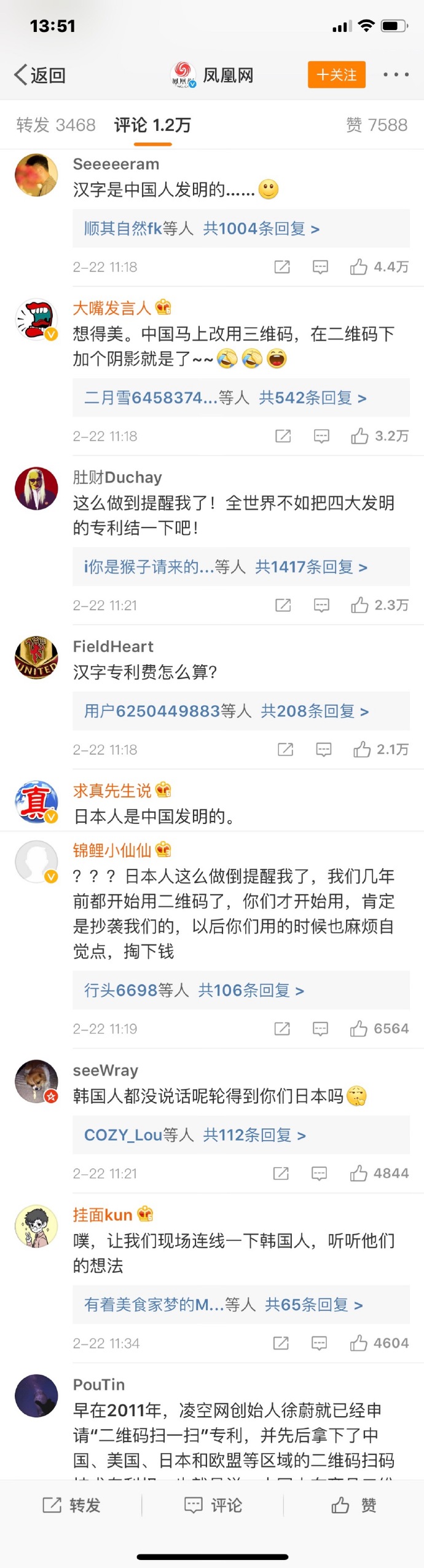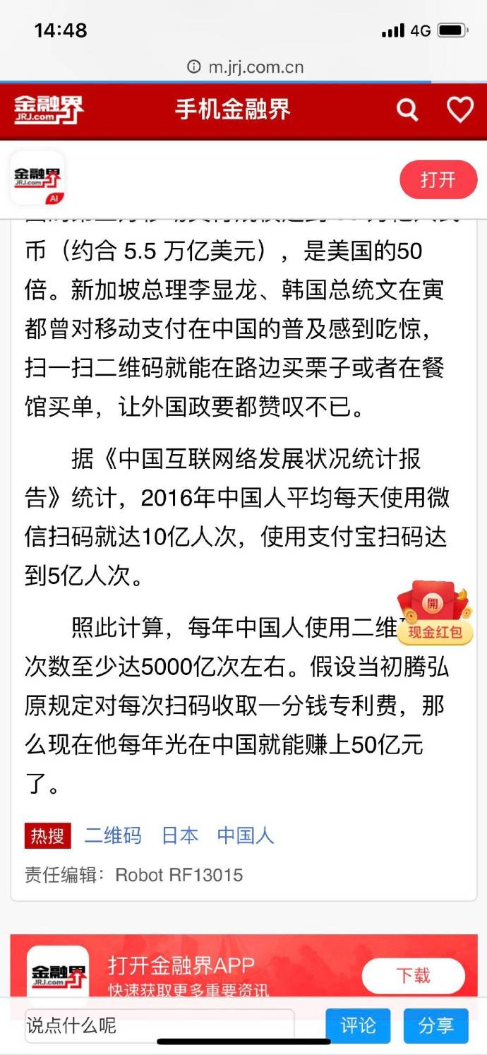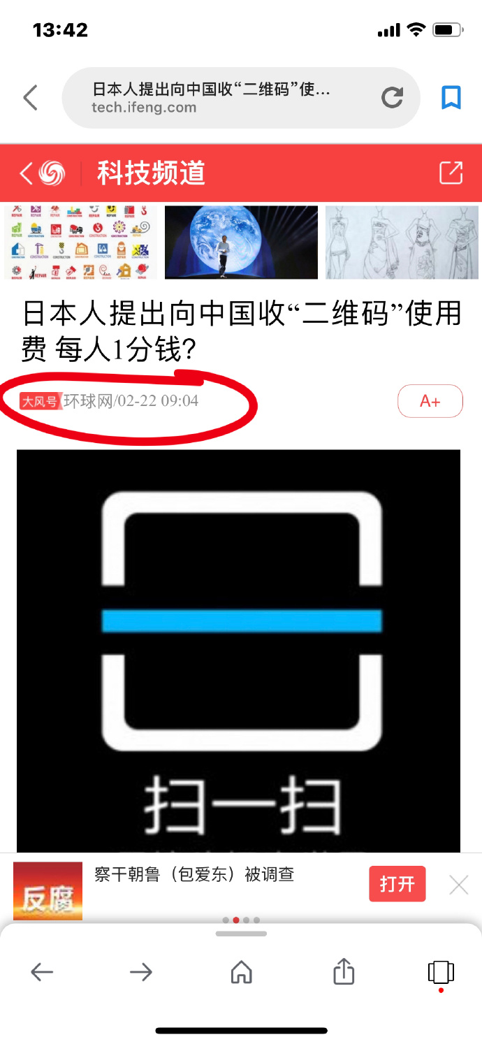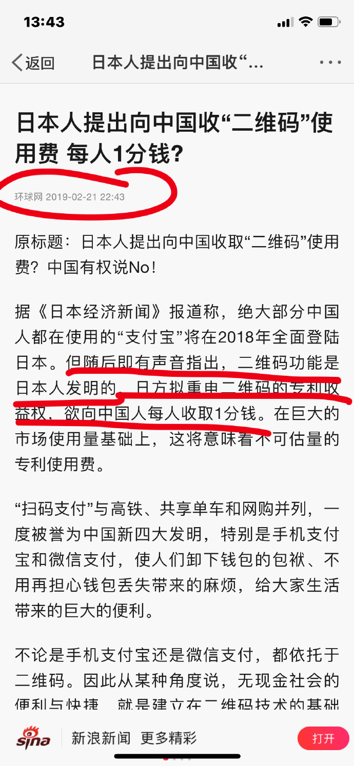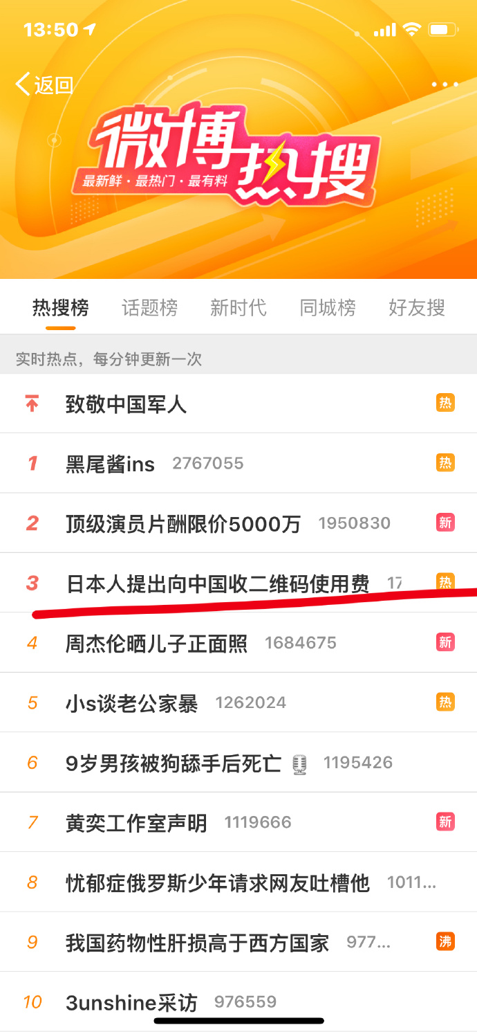 这个话题莫名其妙上了热搜第三,看了下来源全是环球网,环球网原文写着“有声音指出,日本拟重申二维码专利收益权,欲向每个中国人收一分钱”