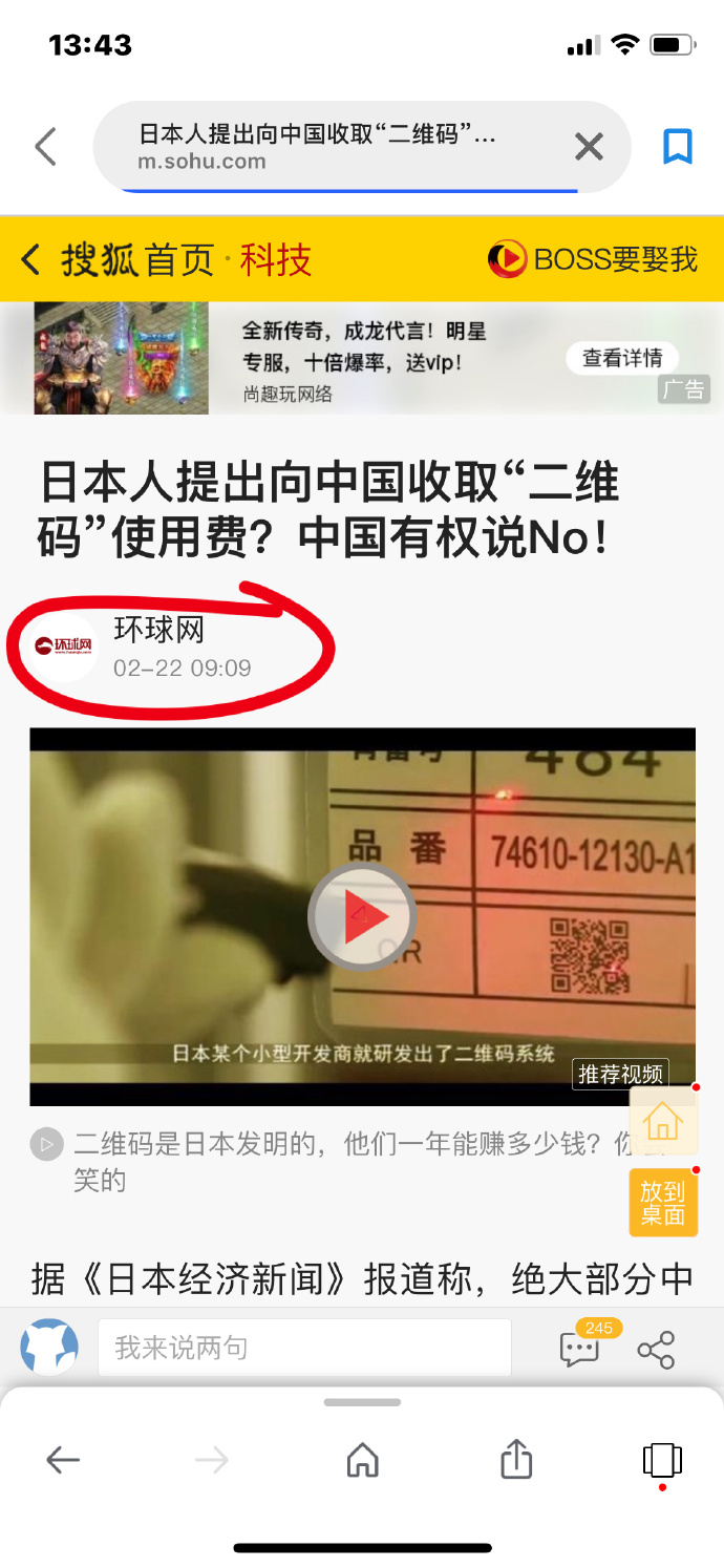 动手搜了日本雅虎,谷歌,根本就没有正规媒体在讨论和报道二维码向中国收专利费这个事,环球网你自己树个靶子自己打,把国人当猴子溜着玩真的好吗?