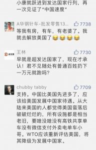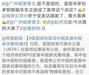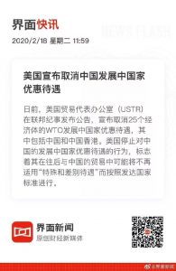 【立此存照】美国宣布取消中国发展中国家优惠待遇 2020年2月19日 原文 来源:公众号“别样一天” 评论区留言: 所在分类:✿图说天朝,今日邮件,中国大陆标签:发展中国家,发达国家 相关文章 建设性意见|上海学生的午餐,吃出了发展中国家的纯正味道 财新网|月收入不足千元,这6亿人都在哪? 【真理部】“美国撤销中国的发展中国家的世贸组织补贴优惠” BBC | Facebook“为中国订制审查工具” 向小田 | 中国中产阶级的虚幻和焦虑