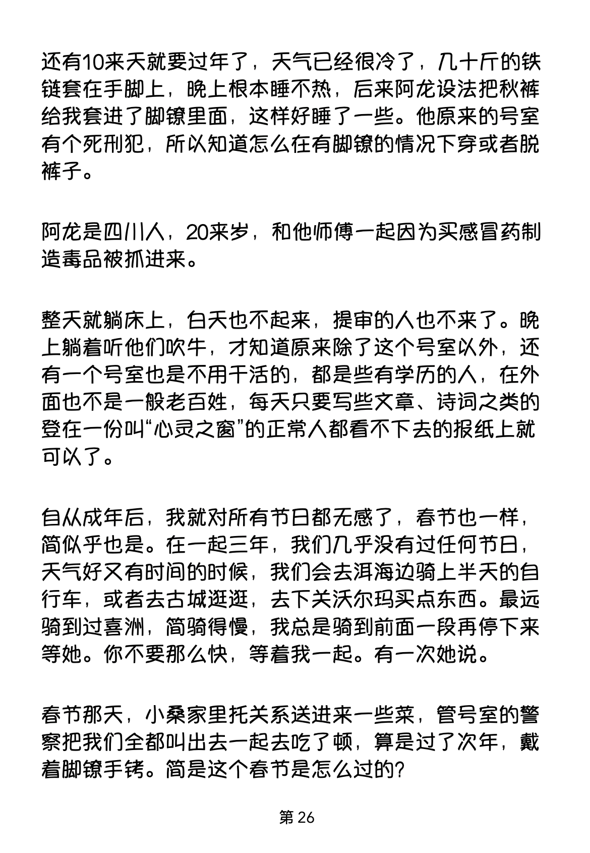 春节那天,小桑家里托关系送进来一些菜,管号室的警察把我们全都叫出去一起去吃了顿,算是过了次年,戴着脚镣手铐。简是这个春节是怎么过的?