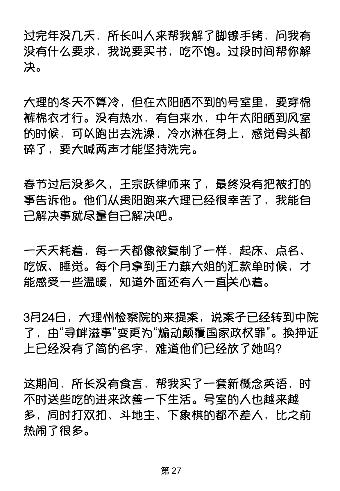 3月24日,大理州检察院的来提案,说案子已经转到中院了,由“寻衅滋事”变更为“煽动颠覆国家政权罪”。换押证上已经没有了简的名字,难道他们已经放了她吗?