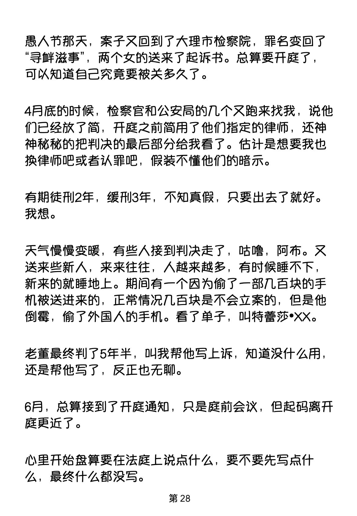 愚人节那天,案子又回到了大理市检察院,罪名变回了 “寻衅滋事”,两个女的送来了起诉书。总算要开庭了, 可以知道自己究竟要被关多久了。