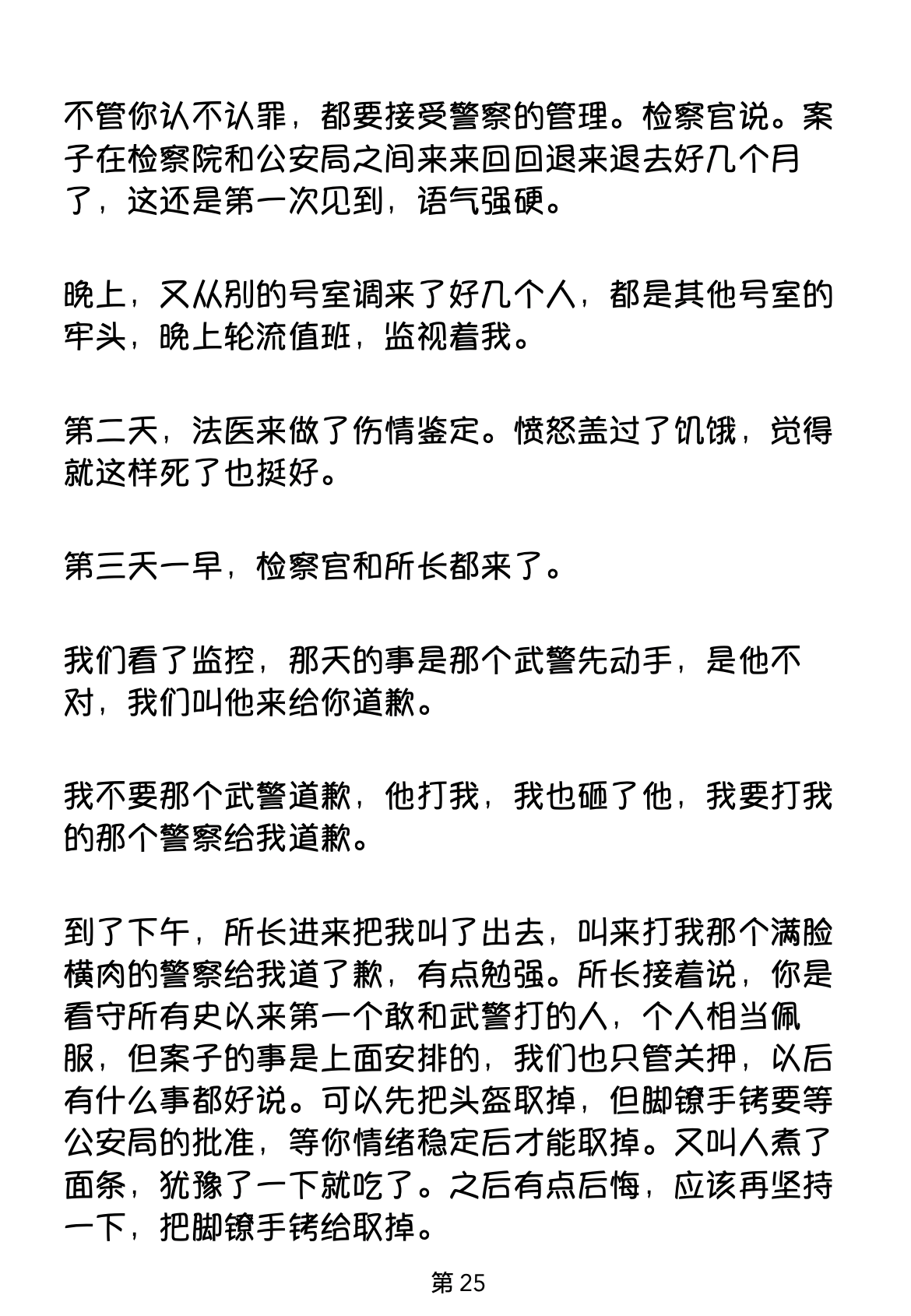 到了下午,所长进来把我叫了出去,叫来打我那个满脸横肉的警察给我道了歉,有点勉强。所长接着说,你是看守所有史以来第一个敢和武警打的人,个人相当佩服,但案子的事是上面安排的,我们也只管关押,以后有什么事都好说。可以先把头盔取掉,但脚镣手铐要等公安局的批准,等你情绪稳定后才能取掉。又叫人煮了面条,犹豫了一下就吃了。之后有点后悔,应该再坚持 一下,把脚镣手铐给取掉。