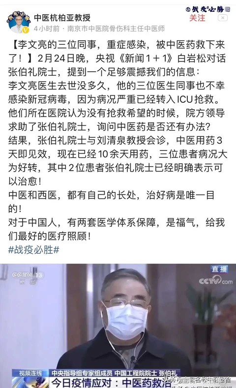 2月24日,央视《新闻1+1》栏目主持人白岩松连线中央指导组专家组成员、中国工程院院士、天津中医药大学校长张伯礼,在视频节目中张特意提到了一个“事实”即:李文亮的三位同事通过中医治疗法“死马当活马医”最终病况大为好转,甚至可能治愈。