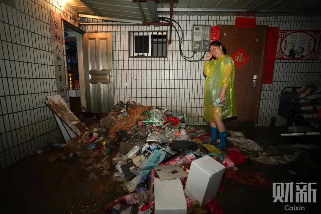 安徽歙县鸿基商贸城文具店店主柳青,面对着货品被泡坏变成垃圾,心疼得留下泪水。Source: 财新