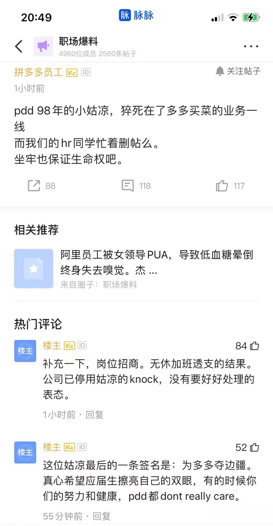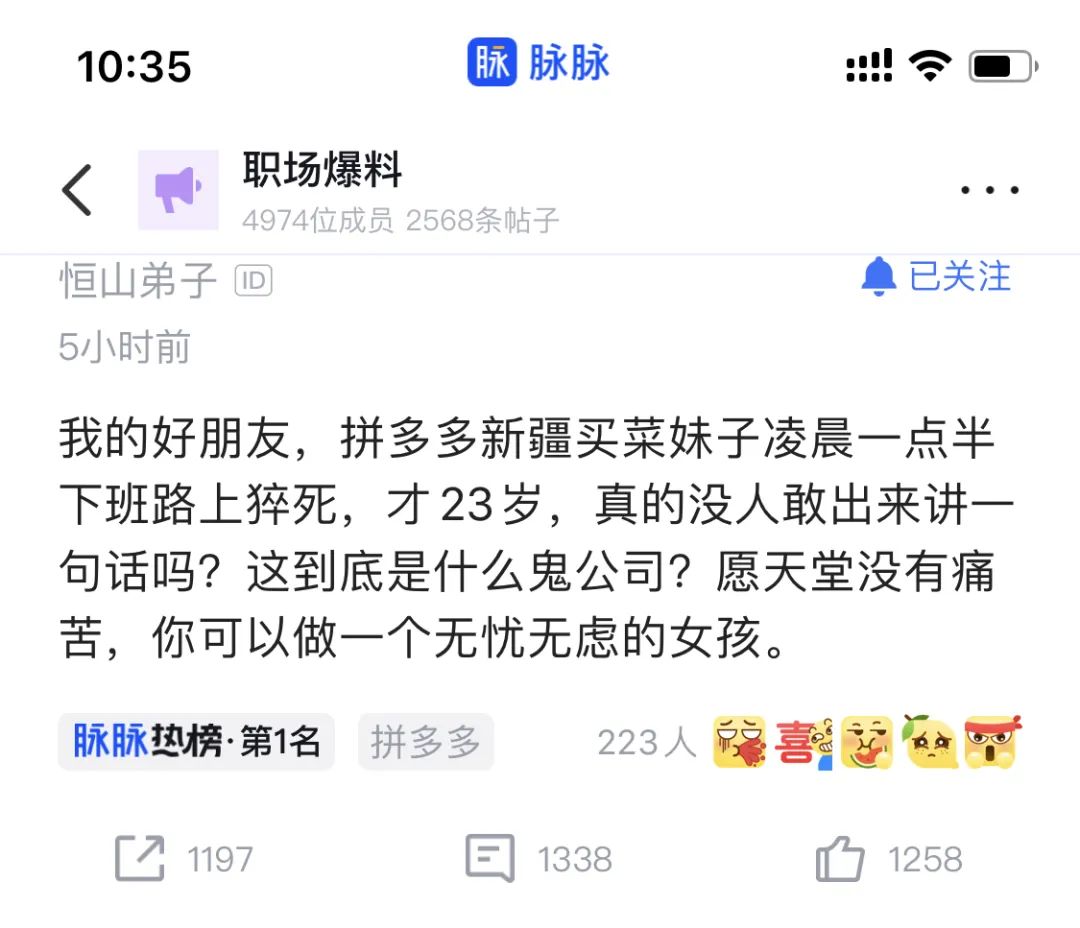 @拆台CT:简单说两句#拼多多员工#的事情。据了解,事情的起因经过是这样的:有网友在脉脉上爆料说,他的好朋友、拼多多新疆买菜妹子于凌晨一点半下班后,在路上猝死。事发时间正好处在元旦放假期间。据传,妹子的内部花名叫润肺,内部IM签名是“肺宝为多多守边疆”,事发之后已被停用。据某认证为拼多多员工的脉脉网友爆料,某司HR正在忙着删帖。此外,某疑似拼多多员工也在知乎爆料称,他在第一时间联系了同在新疆买菜的前同事,但对方的回复非常官方,大概意思就是这事儿完全是造谣,请大家不要传谣信谣,而这几乎证实了拼多多内部已经启动保密措施,(正在尽全力掩盖真相)。有一说一,在当下这个时代,某些公司的公关部门,面对舆情的第一反应居然还是删帖。