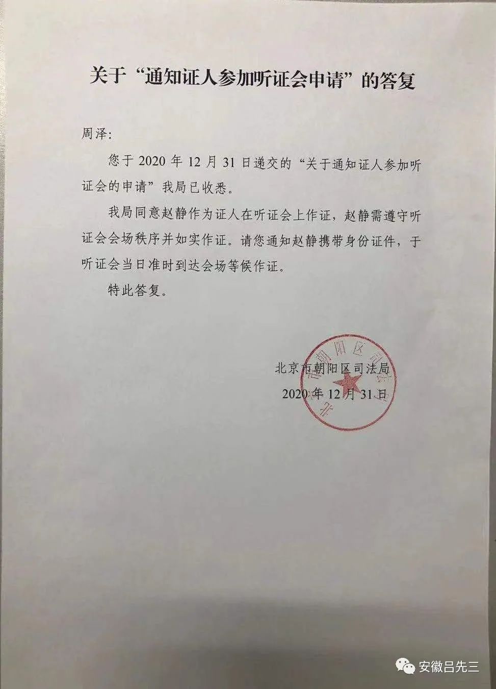 大家好!我是安徽吕先三律师的妻子,也是周泽律师的委托人。原本朝阳司法局同意我在周泽律师听证会陈述作证,还下发了书面通知,但不知何故又被取消,听证会当天我被拦在了听证会门口,在寒风中等待了一天。现公布我准备的听证会陈述。虽然我的文字苍白无力,但总好无言。