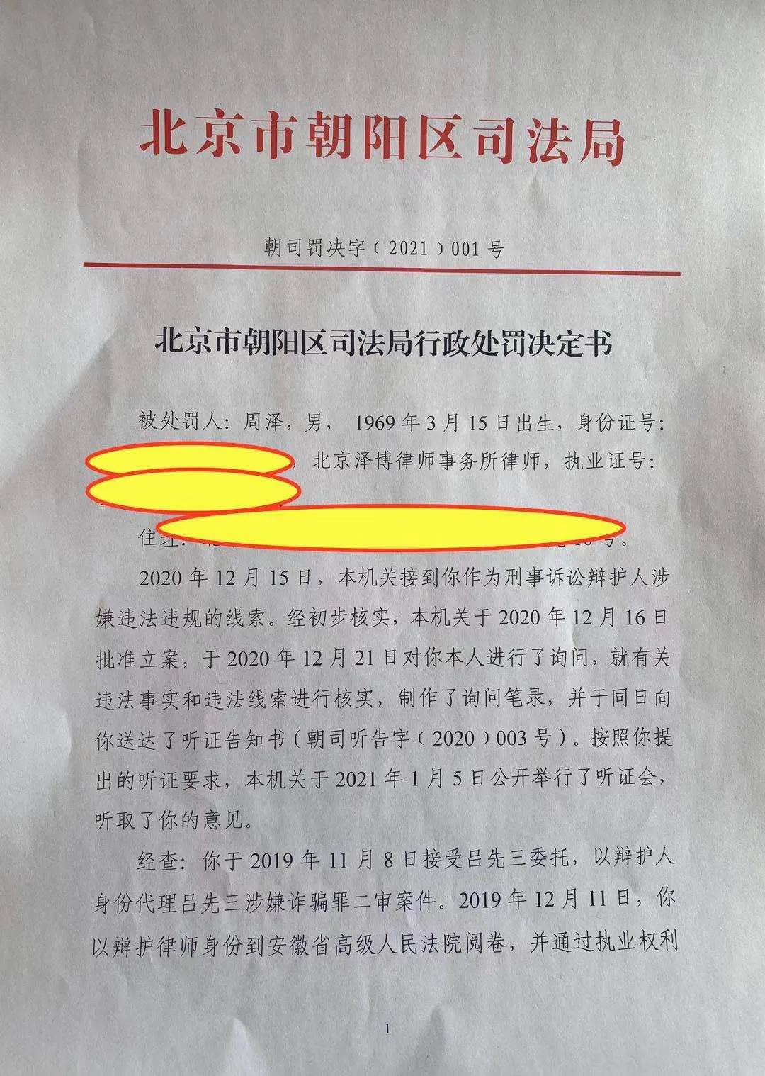 今天(2021年1月7日),北京市朝阳区司法局向我送达了行政处罚决定书。因为批评吕先三案办案机关违法办案、刑讯逼供的问题,办案机关合肥市公安局对我进行投诉,要求北京司法行政机关“严肃处理”。北京朝阳区司法局决定对我给予停业一年的行政处罚。