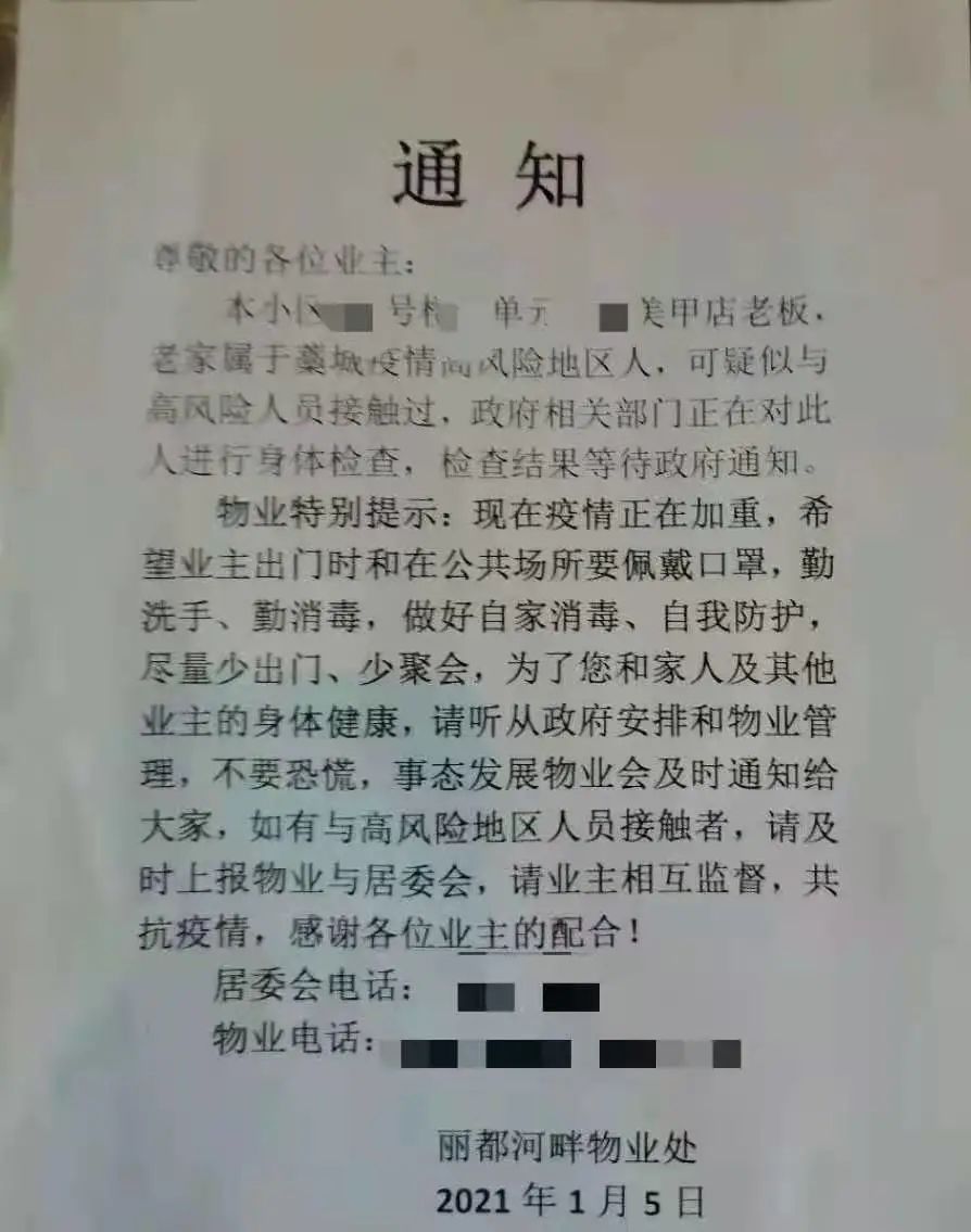 说到信息泄露,我 1 月 5 日被检测出阳性之后。我的美甲店所在的小区张贴了公告。有我的具体地址信息。