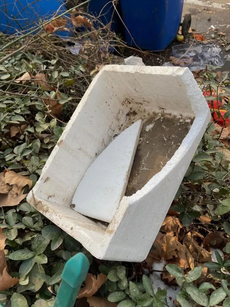 当天盖在老刘头上的塑料泡沫盒被丢在花池里。图/魏荣欢