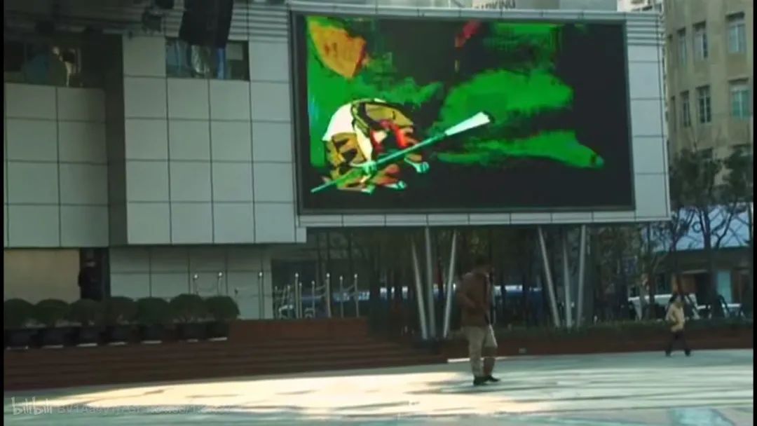 因为在他上方的广告屏幕里,正播着《大闹天空》里太上老君将孙悟空拿下的那一段,他对孙悟空说: