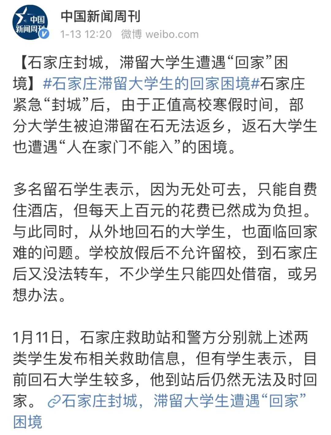 但是,当我作出这个判断的时候,精神是有点恍惚的:去年在武汉发生的一些事情,似乎正在重复。在微博上,有石家庄医生反映,因为小区封禁,公交暂停,自己根本无法上班。一段广为流传的视频显示,有几个大学生在冬夜的石家庄街头“流浪”,他们无法找到出租车,最后,是志愿者车辆把他们送到宾馆。