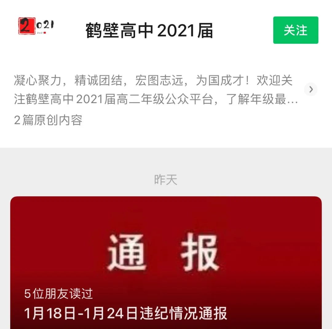 无意间看到了名为“鹤壁高中2021届”公众号,里面充满了让人精神紧张的红色的“通报”,“通报”的内容都是这样的: