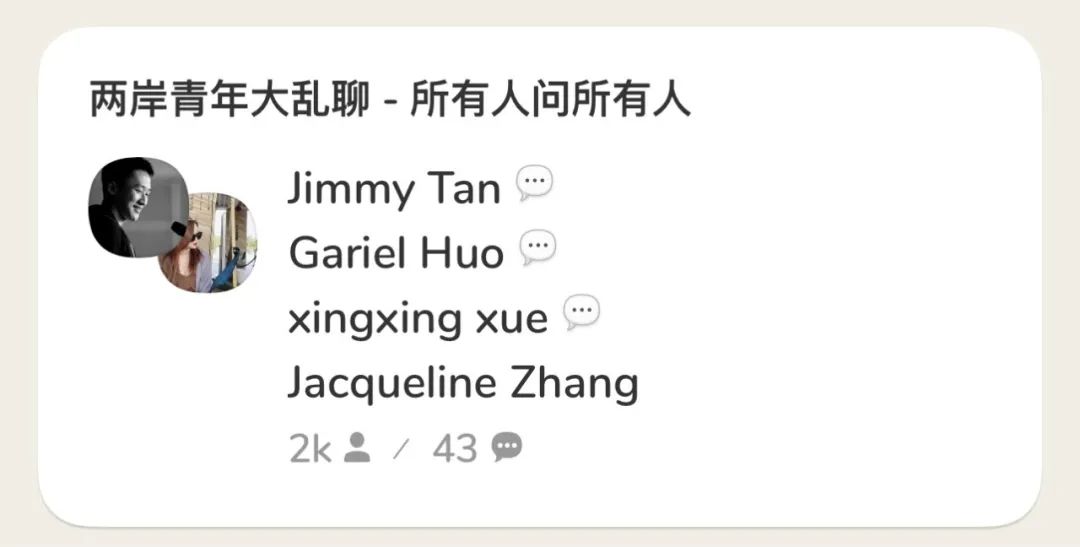 最开始,只是在摸索 Clubhouse 这个软件,隐约感觉到它通过把人和人比文字拉近一点点,或许能让我们重新讨论起来。于是和台湾设计师朋友 Alisa 随意开了一个聊天室,取了一个很大的名字:两岸青年大乱聊 – 所有人问所有人。