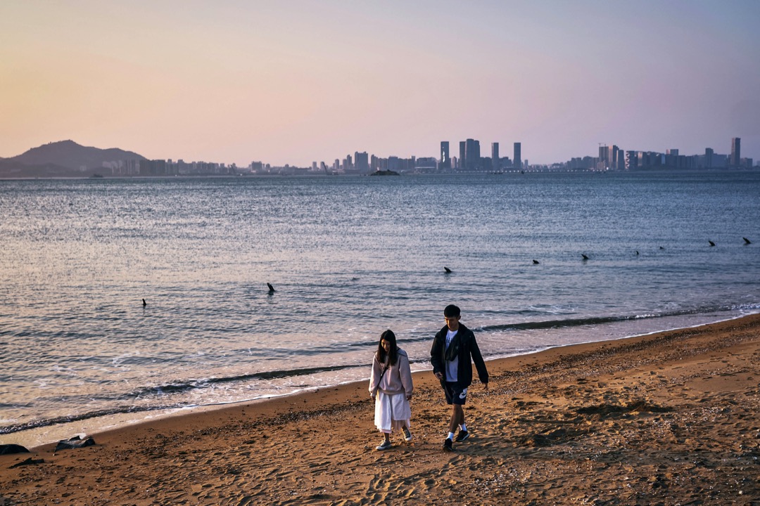 金门眺望厦门的海滩上,一对情侣在散步。摄:An Rong Xu/Getty Images