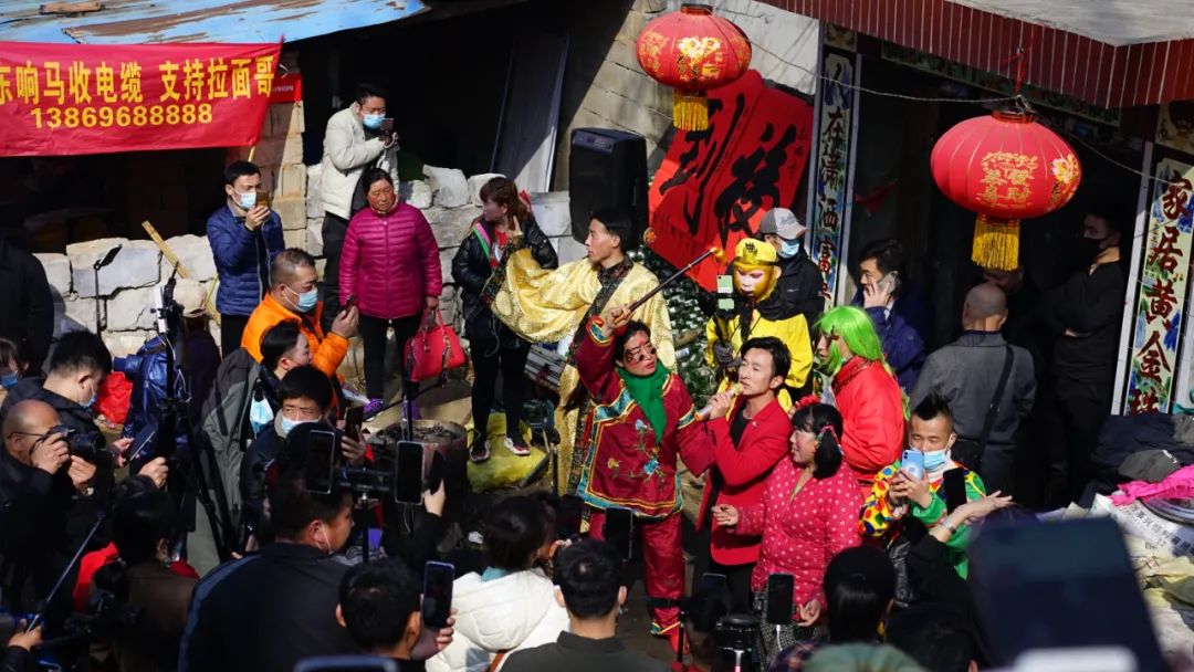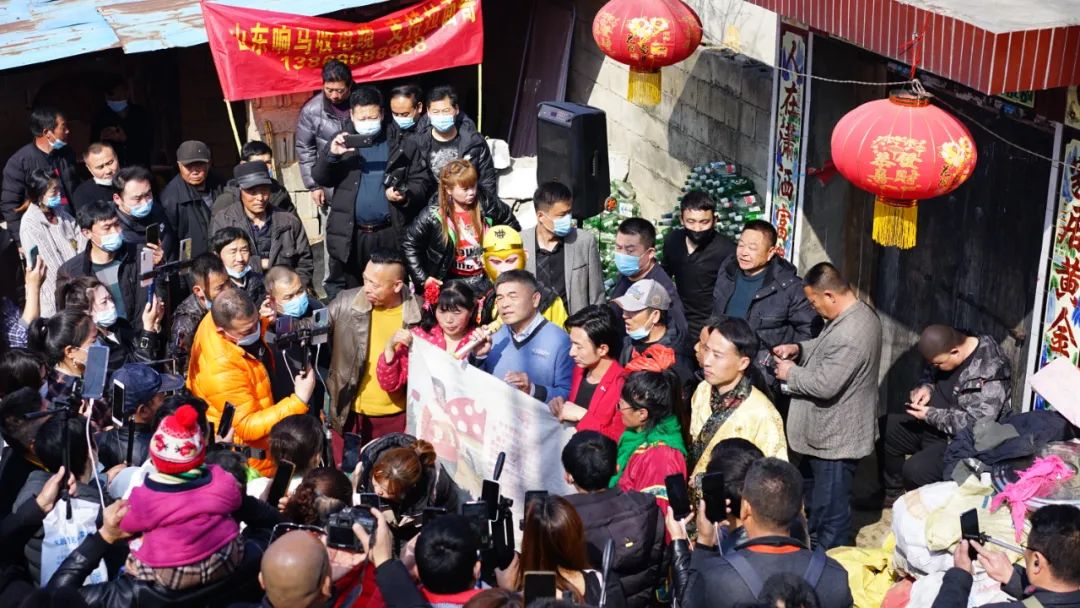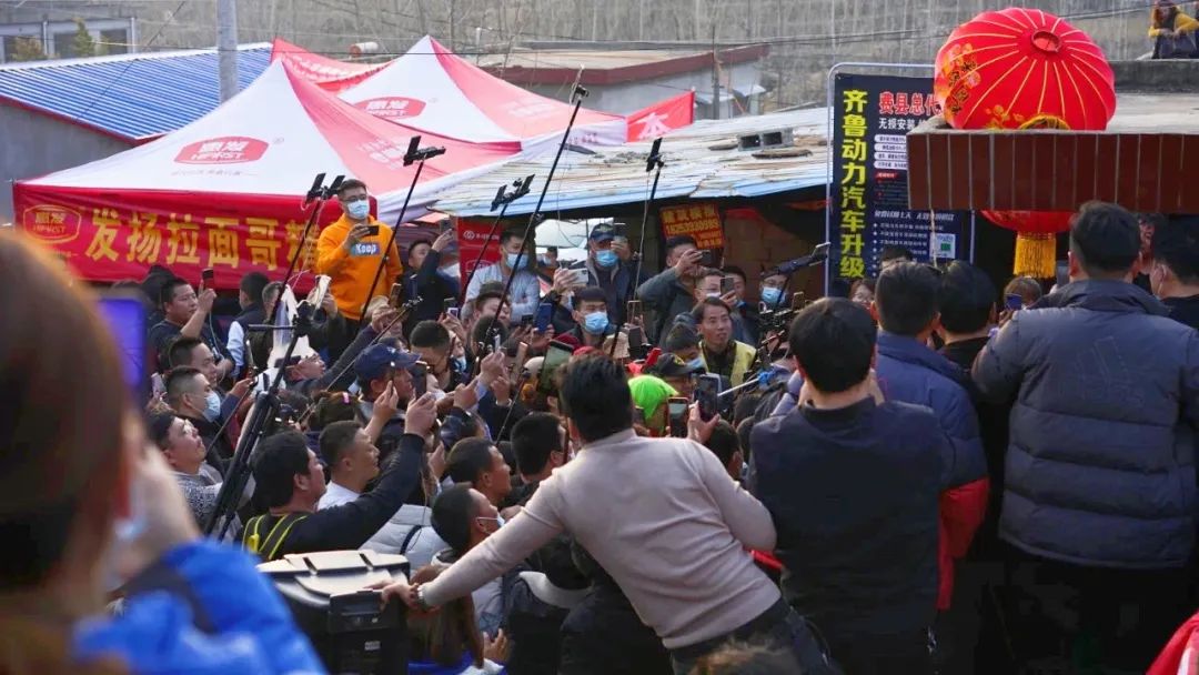 但拉面哥真的就这么火了。仅仅过了一天,他的拉面摊前就已经架满了直播杆。大家都在想办法往里挤,「周边的其他摊位都被挤得没法经营了,」彭佳佳说。最开始的几天,虽然人多,拉面哥还能正常拉面,营业额也翻了倍。后来人越来越多,拉面哥只好收摊躲回了家。围观的人们也举着直播杆跑去了他家——临沂费县梁邱镇杨树行村——一个自称「哪里有流量就去哪里」的主播笃定地说,「以我丰富的经验来看,此时此刻,全中国流量最高的地方就是拉面哥的家门口。」