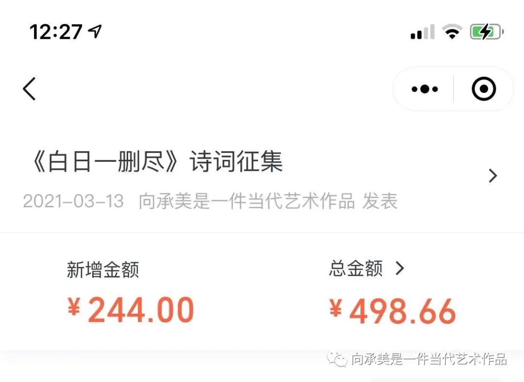 首先感谢网友的智慧贡献,本次诗词比赛只是针对网络新句子发挥,诗词内容和主题投稿者自定,所以文中表达的内容可能不是同一件事,请读者自行分辨。按照之前征集帖的规则,前100首诗中点赞数量最多的获奖,,本次获奖作者是:没有思想只有常识,截止2021年3月16日下午12:27分发稿前,该作者共收获20个赞,奖金都来自此次打赏,本次13人打赏共498.66元,截图为证,感谢所有打赏者,按照规定将全部转给获奖者,本号保留转账记录,获奖者根据自己的喜好和奖金金额自行购买自认为有意义的奖品,希望获奖者告知奖品内容,以奖励下届诗词大赛参与者,但是奖金一经发出,已经是获奖者的私有财产,私有财产不可侵犯,所以告知奖品与否,是获奖者的权力和自由 。这次评选主要根据大众点赞,如有建议可留言改善,共同商讨,这里只讨论诗词评选规则,不讨论其他,多谢。