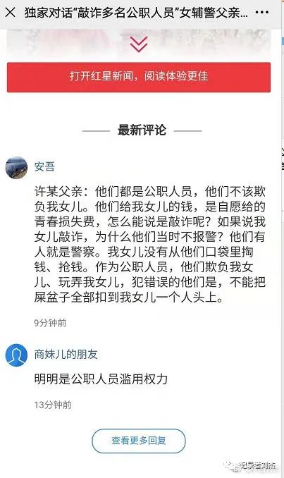 而后,此稿件在微博传开,截至22点05分,相关话题#敲诈公职人员的女辅警父亲发声#在新浪微博阅读量达1.1亿,再点击红星新闻官方的链接,已经变成了404。