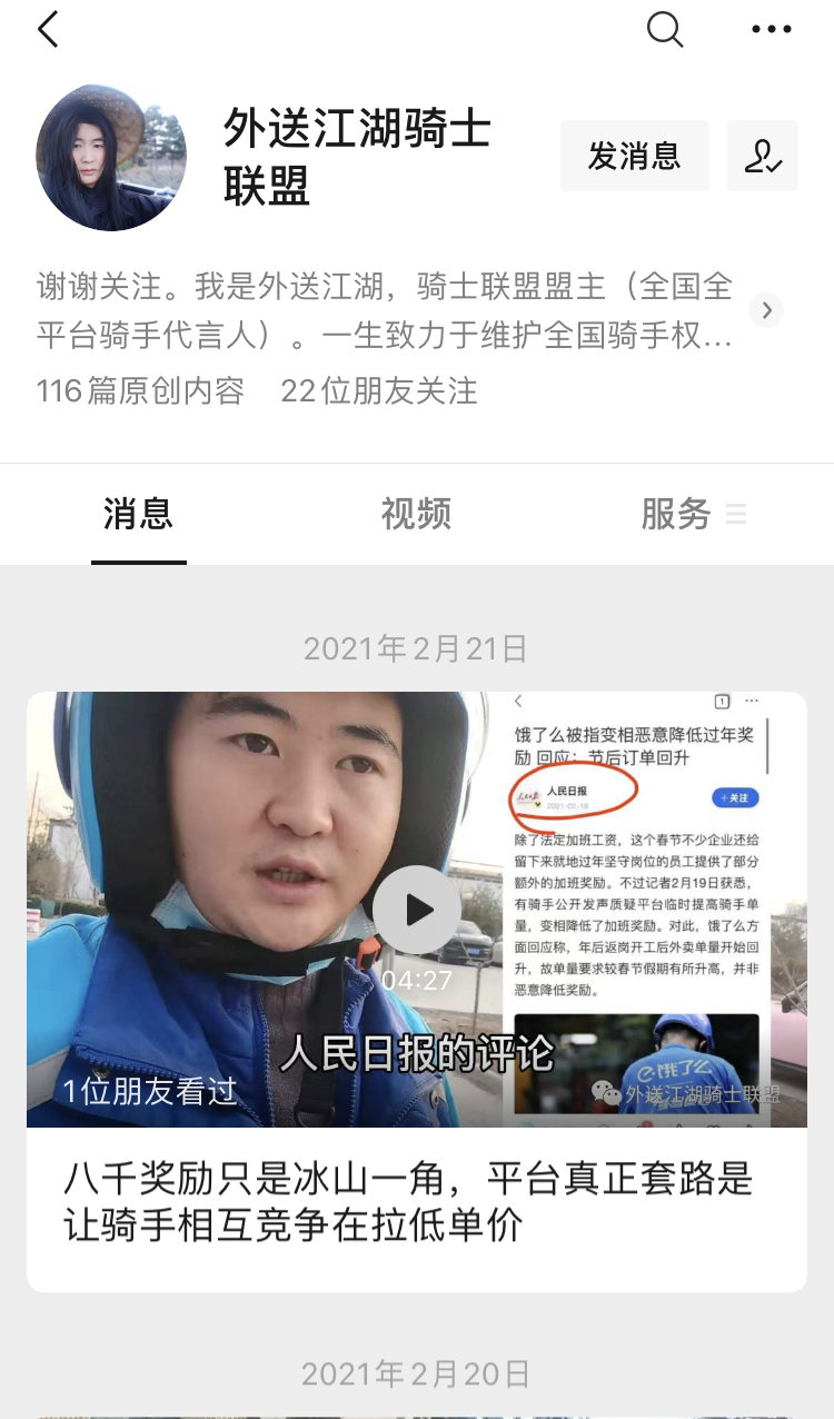 某天,突然一个“撞名”的人进入粉丝群加我,上来就说自己也叫“骑手联盟”,还是北京外卖界的“盟主”,同时转发了一篇有关他事迹的新闻报道。我仔细一瞧,原来是老江湖了,而且也做自媒体,同行加同行,就互相进了一些群进行交流。