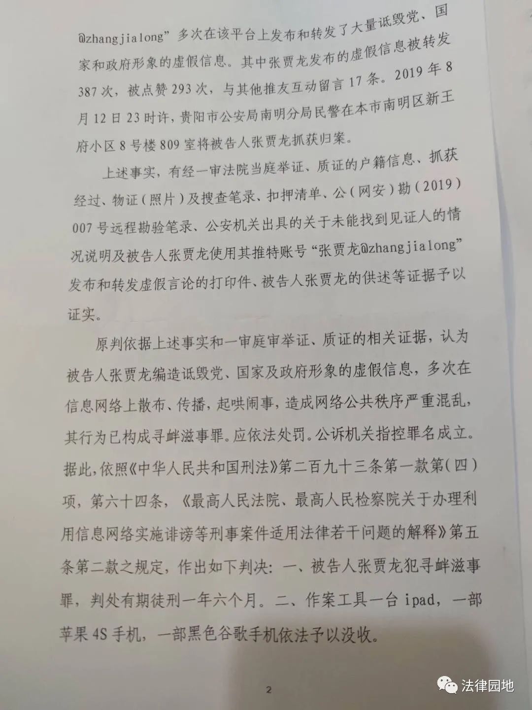 一审开庭审理后,又拖了八个月,直到2021年1月7日才做出判决,南明区法院以寻衅滋事罪判处张贾龙有期徒刑一年零六个月。