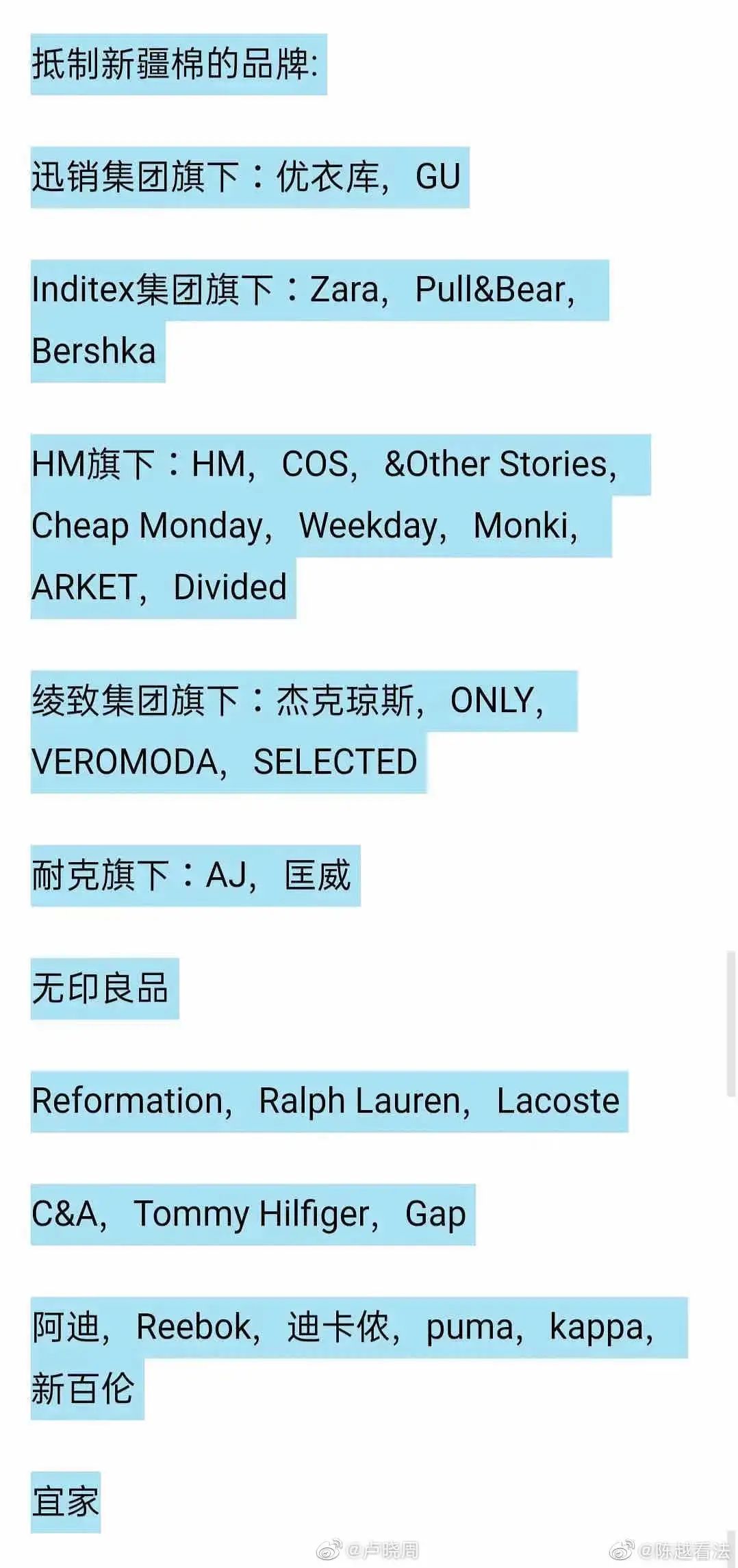 许多大陆明星也表示将与“曾拒绝使用新疆棉花的企业”(几乎都是Better Cotton Initiative组织成员)终止合作: