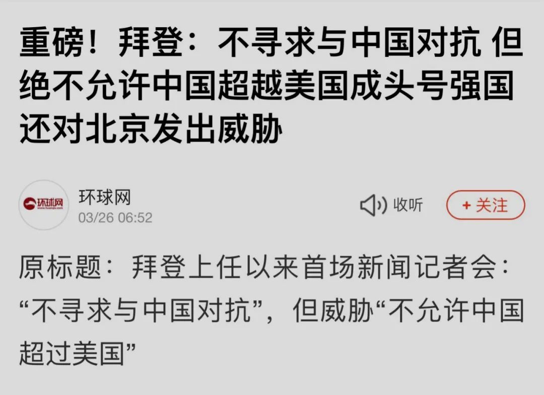 “环时”是这样报道的:“拜登说,不寻求与中国对抗,但绝不允许中国超越美国成为头号强国,还发出威胁。”