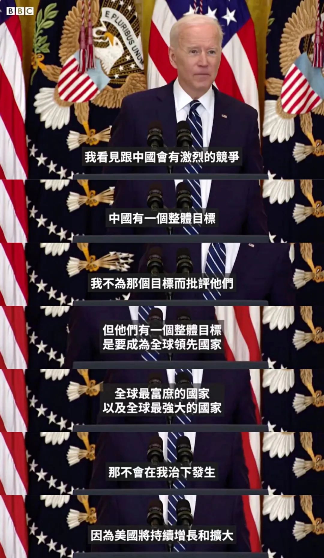 根据这个媒体的报道,拜登是这么说的:“中国有个整体目标,他们要成为世界上最强大的国家……但在我任内这不会发生,因为我们美帝也将持续增长和扩大。”