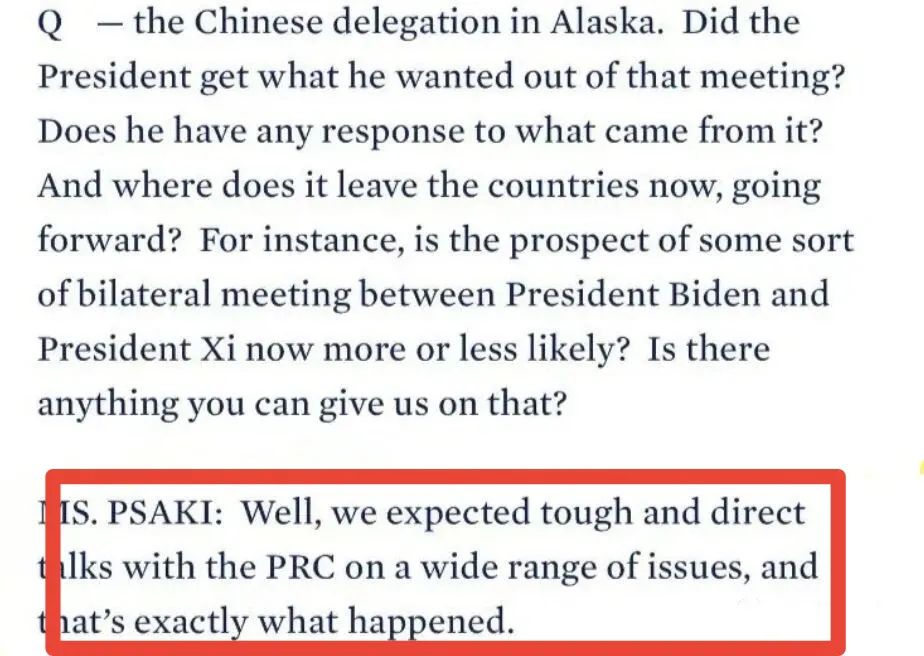 其实,那天美国白宫发言人的原话是:“我们预计会与中国就广泛的议题有艰难和直接的对话,最后正如我们所料,(对话)确实发生了。”