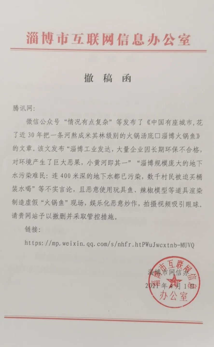 4月1号,《中国有座城市,花了近30年把一条河熬成米其林级别的火锅汤底|淄博火锅鱼》发布,相关污染情况引起了媒体以及网友关注,淄博有关部门反应迅速。就在文章发出当天,短短1 天之内,迅速走出了肉眼可见的关键6步。