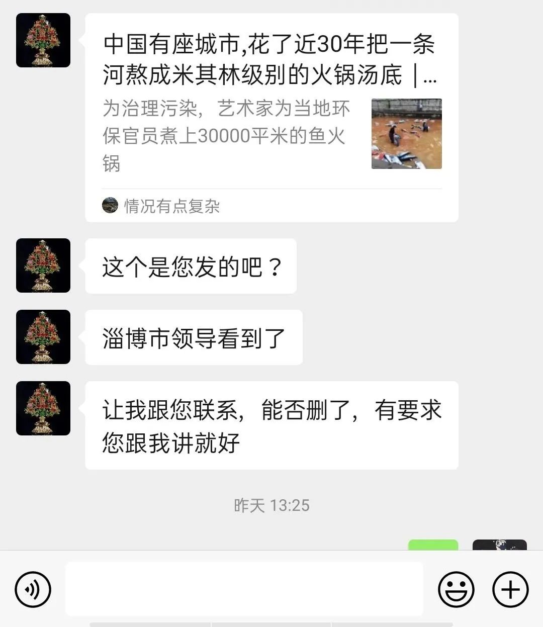 淄博宣传部不仅知道我的电话,还知道我姓什么。但实际情况是,我很多朋友都不知道我姓什么,这工作到位!宣传部的人,除了感谢我发现当地的污染,还强烈表示想和我见面聊聊,不管我在深圳还是其他地方,都想跑过来见我。后来,我只能说不方便见面。