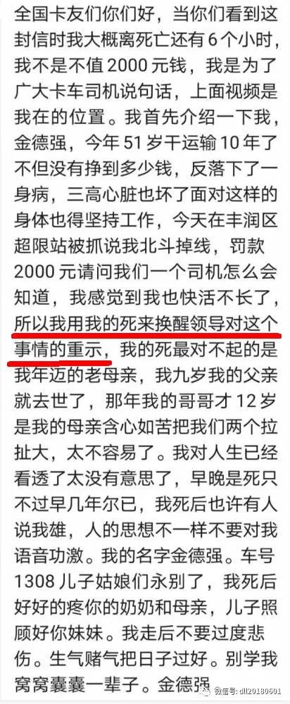 除了自叹命运不济,生活困苦外,遗言表明金德强选择自杀还是有一个很高尚的目标:用我的死唤醒领导对这个事情的重视!金德强要用自己的死为这3000万卡车司机争取合法的利益,减少不合理、不公平的处罚。