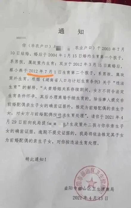 根据该《通知》,当地一男子在2012年与前妻离婚4个月后,前妻生育二孩,9年后被认定为政策外生育。当地卫生健康局要求该男子,提供此二孩与自己为非亲生子女的确凿证据,若不提交,将对其按违法生育处理。