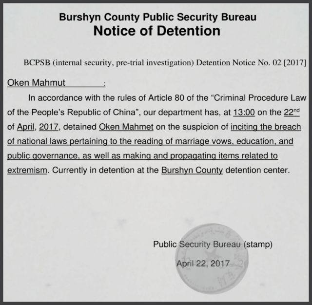 新疆哈巴河县奥肯·马合买提(Oken Mahmet)的拘留通知称,穆罕默德被控“传播极端主义”。根据新疆受害者数据库整理的证词,他的家人说,他因领导周五祈祷和在一座清真寺主持婚礼而被捕。奥肯是一名51岁的哈萨克伊玛目。