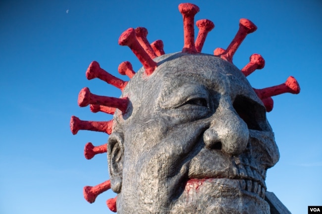 这座玻璃钢材质的雕塑花费了7个月的时间建造。雕塑以新冠病毒的外形为基础,引发疾病的刺突蛋白猩红得耀眼。病毒的球状部分,一半是中国领导人习近平的肖像,另一半是代表死亡的骷髅,骷髅的侧面雕刻着中国共产党的镰刀斧头标志。这座雕塑意指习近平和中国当局在新冠爆发初期的隐藏与不作为,导致疫情蔓延全球,夺去无数生命。作品已经完成,并在六四纪念日当天正式揭幕。